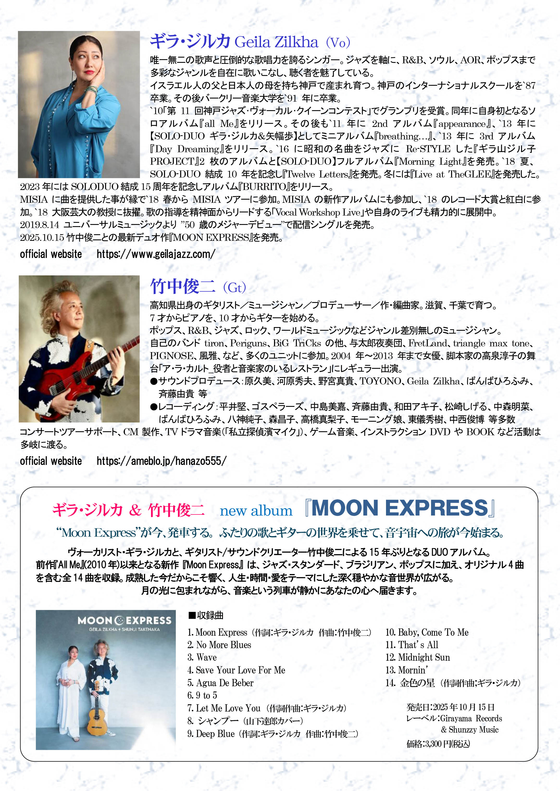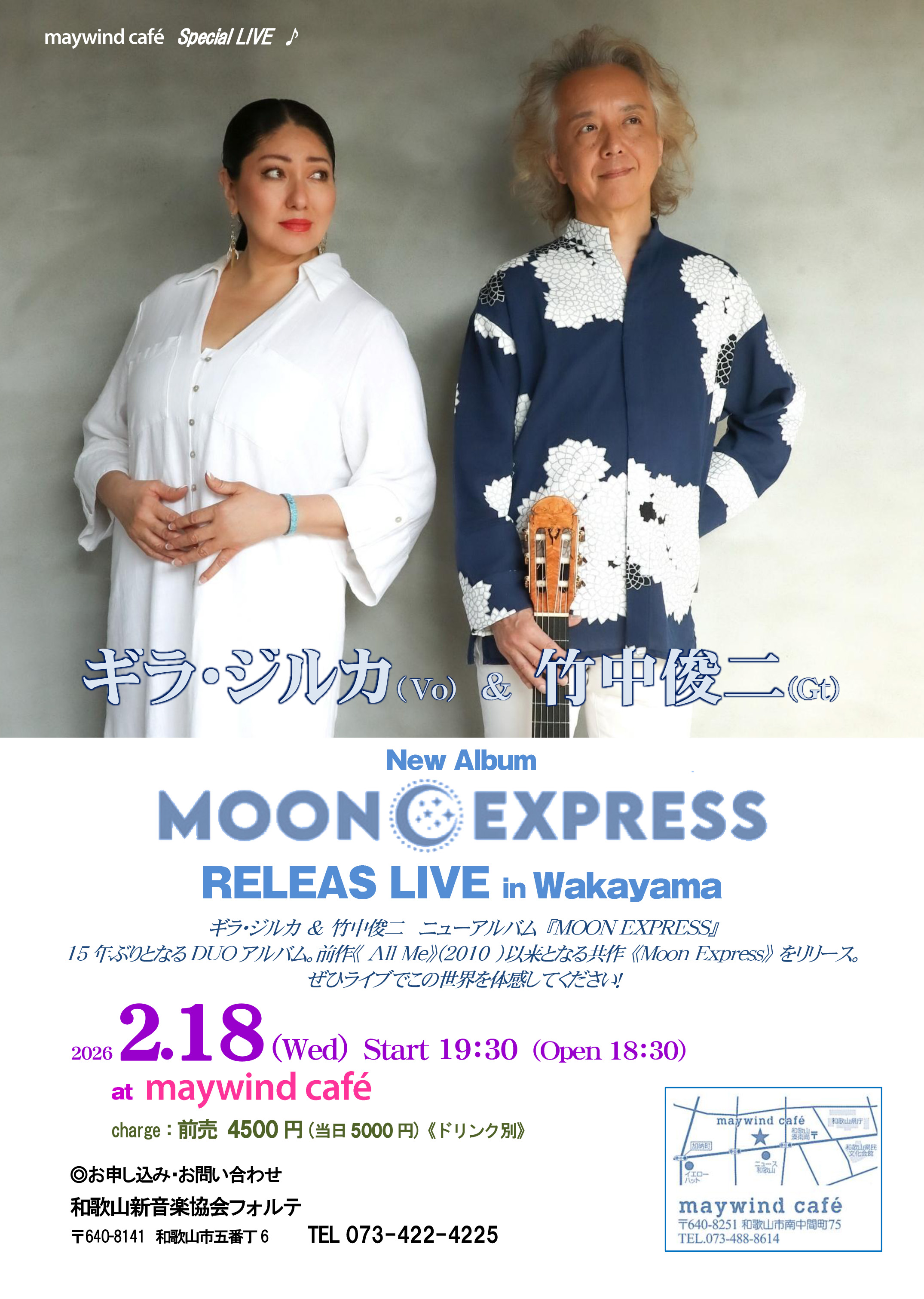 ※唯一無二の歌声と圧倒的な歌唱力を誇るヴォーカリストのギラ・ジルカと、ギタリスト/サウンドクリエーターとして様々なジャンルの多くのアーティストと多彩な活動を展開している竹中俊二がタッグを組み、15年ぶりに新作デュオ・アルバム『Moon Express』をリリース。そのリリースツアーで和歌山にやってきます!